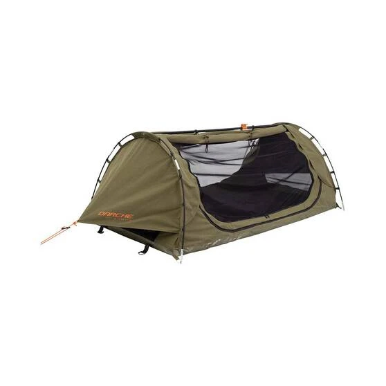 You’ll be having a bevvy around the campfire in no time with the simple set up of the Dusk to Dawn Swag. Simply peg it out, insert the 2 compose end poles and the trigger locking ridge pole and you are ready to go. The Dusk to Dawn has excellent ventilation with 2 large super-fine 125gms mesh doors and 2 zip down windows. The storm covers convert to awnings for added shelter and protection from the elements (poles sold separately).