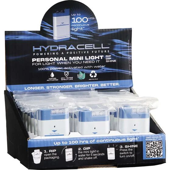 Introducing the Hydracell Mini Light, tough, long lasting and environmentally friendly! Hydracell torches don’t run on your standard alkaline batteries, instead they are powered by a Hydracall water activated battery fuel cell. The Mini Light has been designed as a single use, disposable light that is perfect in emergency and off-grid situations. Simply dip it in water and you will get up to 100 hours of light. Once the unit has been used it can be safely disposed of in your household garbage. Make sure to add some Hydracell Mini Lights to your kit before your next outdoor adventure!